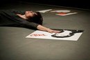 Del público, lentamente y a ciegas, se desliza Rosa Muñoz a dentro del cuadrado marcado y comienza el dialogo entre ellas. Tendrá ojos cerrados durante todo la performance. Juego de interactividad entre el espacio físico y el espacio mental.