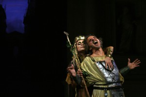 Giuseppe Emiliani, che firma la regia de Le baccanti, andate in scena in anteprima al Teatro Olimpico di Vicenza, si serve di una donna travestita da uomo per giocare sulle dualità che segnano quotidianamente le nostre vite, scegliendo di sottolineare il conflitto che divide l’universo maschile da quello femminile. Interpretato da una bellissima e statuaria Laura Marinoni, il dio Dioniso scende sulla terra travestito da uomo, portando con sé ogni tipo di contraddizione, scontro e follia. Egli è uno ‘straniero’ con la colpa di aver guidato verso la pazzia tutte le donne di Tebe che, rifugiatesi sul monte Citerone, celebrano i riti baccanali; proprio per questo il dio androgino attira su di sé l’odio del sovrano Penteo, il bravissimo ed energico Francesco Migliaccio. Il rovesciamento delle parti avviene ancora quando la Marinoni convince il giovane re a mascherarsi da donna per poter spiare le baccanti: ma proprio tra le irrazionali e invasate menadi questo trova la morte per mano della madre Agave – l’impeccabile Susanna Costaglione. Fuori di sé, non riconosce lo scalpo del figlio e comprende la tragicità dell’atto compiuto quando Cadmo, il vecchio re e padre della donna interpretato da Virgilio Zernitz, la riconduce alla ragione.