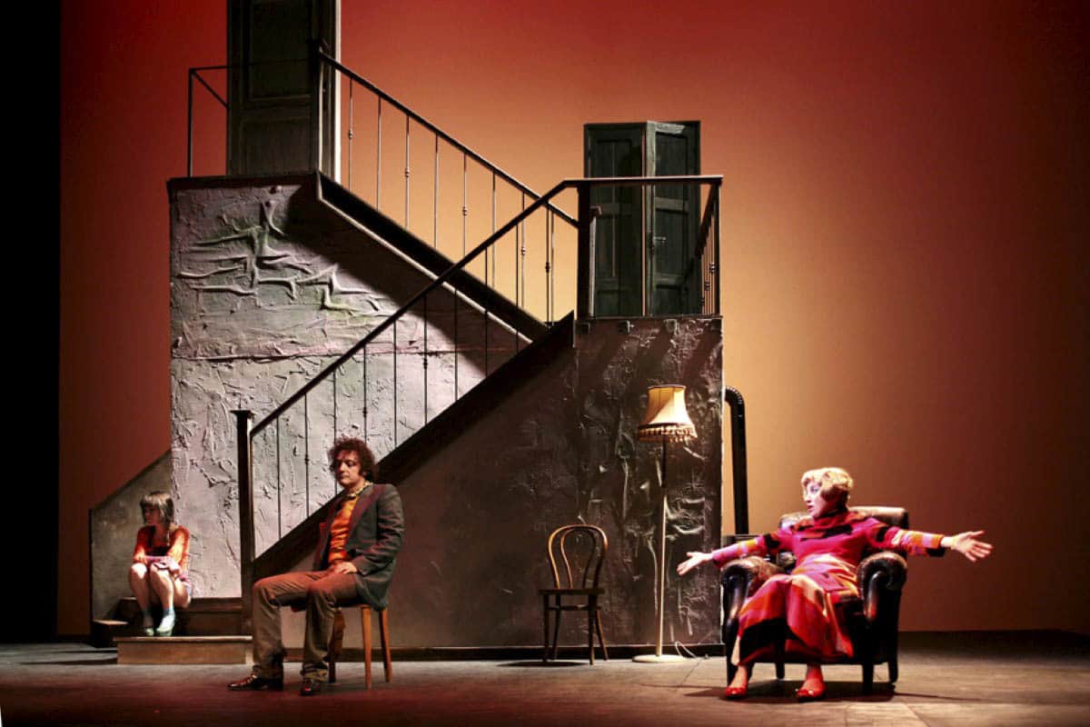 La semplice scena realizzata da Antonio Panzuto diventa funzionale alla trama, sposandosi perfettamente con il testo; il giornalista scende le scale continuamente quasi a simboleggiare il continuo scavare nel profondo della personalità del Tiraboschi. Solo durante l’ultima visita, passati dieci anni, Rozzi sale le scale, avvicinandosi all’ultima porta posta in alto, dietro a cui si trova il letterato: è il momento in cui avrebbe potuto intervistarlo, momento tanto desiderato in gioventù, ma che è arrivato troppo tardi, quando, un ormai stanco e provato Rozzi, non lo cerca più.