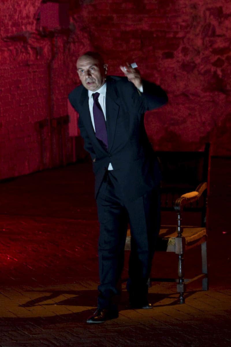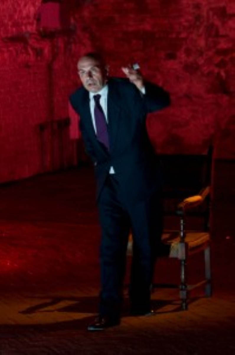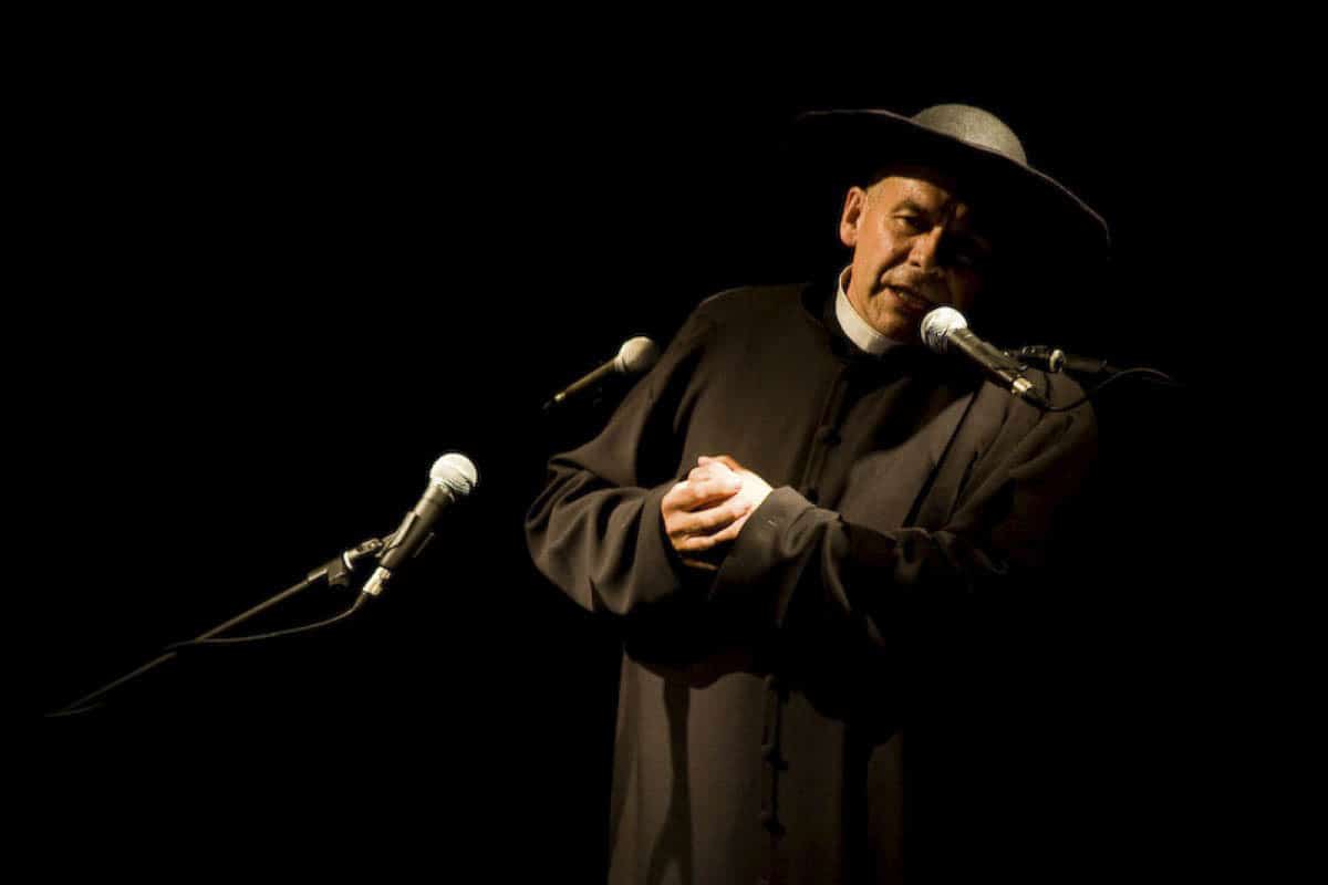 In scena solo tre microfoni ad asta e rigido, in piedi, vestita di lungo abito ecclesiastico, la figura di un eccessivamente alto prelato echeggia quella del vicario de La monaca di Monza rappresentata nel ’67 da Luchino Visconti. Da lassù, posizione privilegiata, il funzionario di Dio, consiglia, giudica o lascia correre, esercitando la sua professione di sacerdote in un piccolo paese di montagna. Tutto procede senza intoppi fino a quando una vecchietta lo pone di fronte a una domanda a cui egli non può rispondere: e se lei volesse uccidersi? Il tema del suicidio visto con gli occhi di un’anziana signora, stanca delle fatiche quotidiane e spaventata dal protrarsi della vecchiaia, cammino in salita verso la morte, ci appare qui in tutta la sua drammaticità.