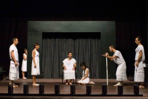Certo la confusione è molta, anche per via della velocità con cui le diverse scene si susseguono e intrecciano; ma il Sogno regge, soprattutto nel passaggio dalla tridimensionalità Ateniesi-Fate-Artigiani alle vicende ambientate univocamente nel bosco. Nell’ombra della foresta succede qualcosa – e quando lo spettacolo riprende, dopo la pausa fra primo e secondo atto, tutto è uguale ma qualcosa non torna. I comici cominciano a tastare un po’ di poesia con le parole della commedia che devono provare, il rigore di Atene vacilla nel fervore degli amanti perduti nel bosco, nelle loro mille e una liti piuttosto che fra i labirinti dell’innamoramento. Le tre linee drammaturgiche, unite qui nell’unica ambientazione della foresta si avvicinano e si guardano, si conoscono addirittura in qualche caso, si dilatano, si contaminano, cosicché la schermaglia amorosa fra le due giovani ateniesi finisce in rissa, mentre l’interrogazione tutta teatrale di un muratore – come riprodurre in scena il chiaro di luna – apre a vertiginosi attraversamenti estetici e poetici. Ma quella che potrebbe essere poi una precipitazione verso una sapiente fusione è ostacolata dall’enorme attenzione riservata alle parti dei comici: la trama convenzionalmente principale, con le coppie e iloro scambi, sembra far da spalla alle prove degli artigiani, veri protagonisti – sulla carta e sulla scena – di tutto lo spettacolo. La troupe, composta dalla crème della giovane comicità nelle sue declinazioni più dissacranti e incontenibili (Riccardo Goretti, Francesco Rotelli, Luca Zacchini degli Omini e Nicola Danesi di Tony Clifton Circus), con Alfonso Postiglione e Diego Sepe, occupa il cuore della commedia e della regia civichiana con un affastellarsi di gag che mirano a spostare sempre un po’ più in là la risata dello spettatore, in un vortice di doppi sensi esibiti e ammiccamenti ripetuti. Sarà per la cronotopia propria del comico o per l’affiatamento evidente fra alcuni elementi del gruppo, per il talento vorace di tutti i suoi componenti, per la leggerezza della recitazione o la riconoscibilità a volte rassicurante dei boom satirici proposti. Una dimensione a doppio taglio che pur distinguendosi per compiutezza ed efficacia, ruba, per merito o per forza, la scena alle altre due e resta sospesa fra ripetitività e risate – forse bloccando con la propria irruenza altri percorsi o elementi dello spettacolo che meriterebbero o invocherebbero, in certi momenti, pari concentrazione.