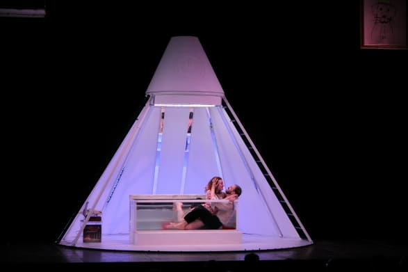 Il passaggio alla seconda parte, in cui viene presentata la visione del protagonista maschile, avviene con un cambio scena: la struttura si priva del telo che l’ha finora ricoperta e al suo interno, in una lussuosa stanza d’albergo a forma di mausoleo, il Presidente si esibisce in un’autocelebrazione. Un monologo esplosivo di colui che «tutt’un tratto ha avuto l’idea di diventare un uomo politico», guida di «un Paese che non lo merita e in cui non può realizzare ciò che ha in testa». Il pensiero di un dittatore che ritiene che allentare i freni in politica generi anarchia e che i giornali siano la manifestazione di un complotto fatto di carta. L’incisività e la crudezza che caratterizza il soliloquio della Moglie trova riscontro solo in parte nella seconda metà dello spettacolo a causa dell’insistenza, non del tutto giustificata, sulla figura dell’amante-attrice, la “nuova Duse”, e di una forzatura vocale e gestuale del personaggio interpretato da Paolo Coletta.