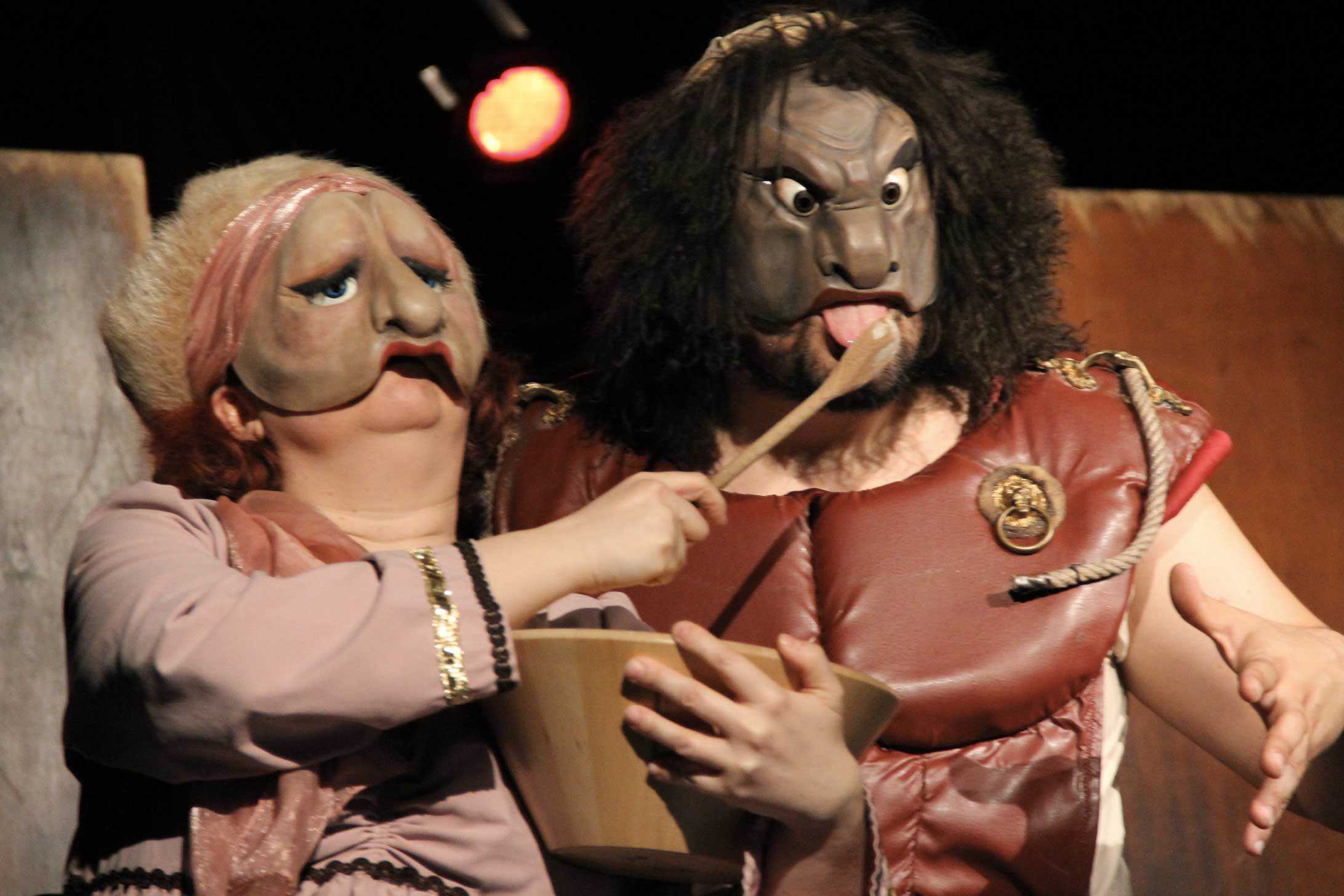 Il concepimento dell’eroe traccia le linee dello spettacolo messo su dalla compagnia di Piove di Sacco (Pd). Quattro attori in maschera – create appositamente da Matteo Destro, regista della commedia – ne riproducono altri cinque in scena, in tutto nove, (s)doppiandosi – e triplicandosi – in ruoli diversi. La struttura calca l’impianto grecanico classico, innestando innovazioni nel linguaggio espressivo: il coro è emancipato in quartetti musicale narranti per canzonette simil sigla di cartoon; i personaggi recitano in maschera, adottando gli sberleffi della commedia dell’arte, e distogliendosene relativamente ai rigori di forma e caratterizzazione; la (bio)meccanica omaggia la primitività teatrale con pantomimiche da burattini rompendo col la fissità della corporeità classica; la dialettica è scanzonata, dialettale (da nord a sud), per niente ampollosa o enigmatica.