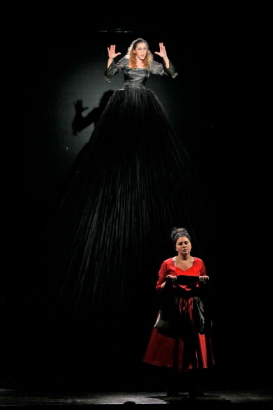 «In questo Stato oramai regna l’ambizione, l’odio e nient’altro», ripete con ritmo ossessivo la signoraa se stessa e alla governante, silenziosa figura che si prodiga per soddisfare le richieste della sua padrona. Silenziosa sì, ma interiormente ribelle nell’accelerazione di una corsa ai “piedi” della protagonista e dentro/fuori la scena. La donna è vestita a lutto, un abito che indossa ormai da tempo; appare nella sua magnificenza rialzata ad alcuni metri dal suolo, incastrata fino a metà corpo in una grande gonna: una struttura conica che rimanda al cumulo di sabbia che imprigiona Winnie in Giorni Felici di Bob Wilson e che viene celata da un leggero tessuto nero plissettato che scivola morbido su di essa. C’è stato un attentato e loro non dovevano trovarsi là, al Monumento ai Caduti, continua a ripetere la donna. Hanno sparato – gli anarchici! – e c’è mancato un pelo che non colpissero il Presidente. Nel delitto è stato ucciso il colonnello e l’adorato cane della signora, la sua suprema istanza, è morto di crepacuore quando ha sentito lo sparo. Un soliloquio logorroico e calzante, caratteristica compositiva di Bernhard, che restituisce tuttavia la lucidità di colei che si è ritrovata sposa di un dittatore che tormenta tutti, capo di uno Stato in cui oramai domina solo la paura, l’ambizione, l’odio e nient’altro.