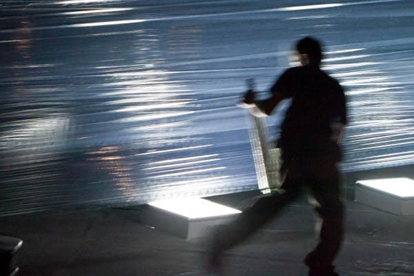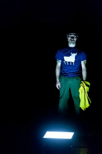 Il lavoro, come emblematicamente esprime questa scritta, si mostra tramite una serie di passaggi di costruzione live della scena e del testo, che fanno da contrappunto alla partitura “vera e propria”. Basti pensare all’attrezzeria, tutta fatta da strumenti edili o quasi (nastro adesivo, cellophan industriale) o al meticoloso lavoro sulle luci (lightbox, lampieggianti, torce) che sono attivate e stimolate drammaturgicamente come se fossero zoom per mettere meglio a fuoco, da vicinissimo, alcuni dettagli visivi o performativi. Ma verrebbe da chiedersi qual è il percorso legittimo fra costruzione dello spettacolo e messinscena in senso stretto, vista l’equilibrata proporzione che si esprime nella coesistenza tutta particolare fra attore e performer, fra realtà e finzione, mirata − come in altre esperienze della scena emergente − a rivalutare le specificità dell’artigianato teatrale, delle sue grandi magie fatte con poco e forse, come vedremo, a scardinare qualche cliché della dicotomia che vede tradizionalmente opporsi rappresentazione e performatività.